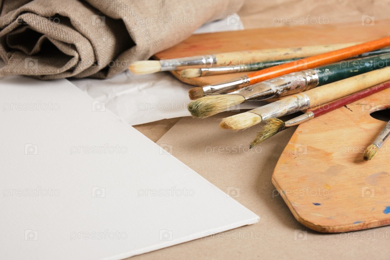 Набор кистей, краски в тюбиках, деревянная палитра, белый холст на картоне и бумага на льняном фоне, концепция мастерской художника