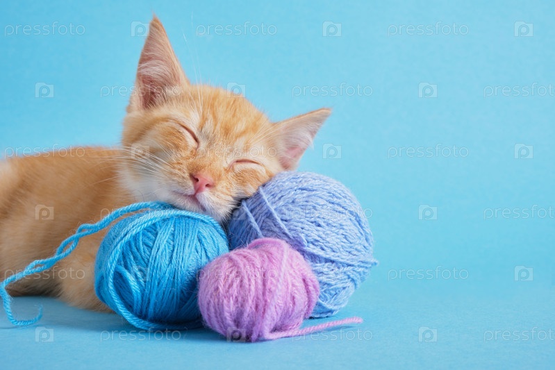 Милый рыжий котенок спит на клубках ниток разных цветов, синем фоне копировального пространства