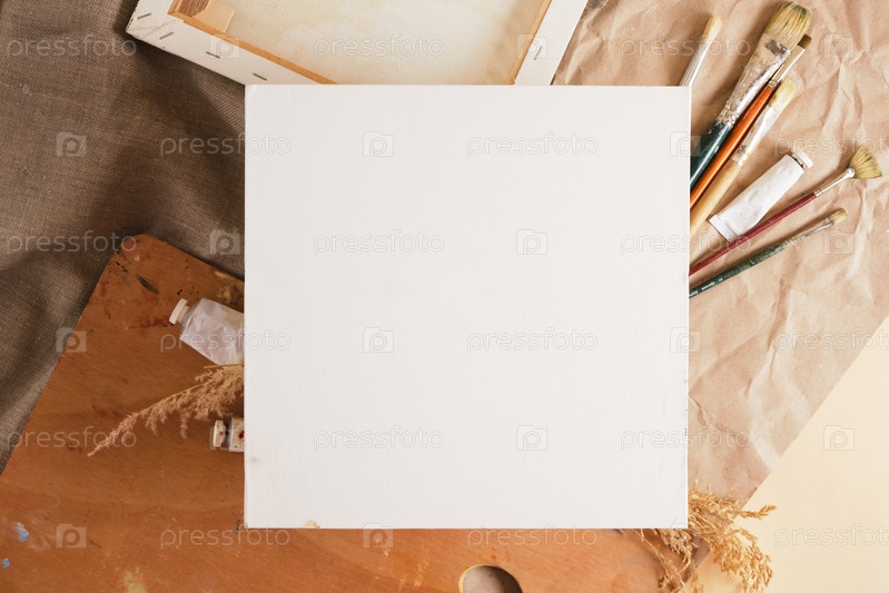 Белый хлопковый холст на картоне и различные инструменты художника макет фона, пустой квадратный холст, вид сверху на пространство для копирования