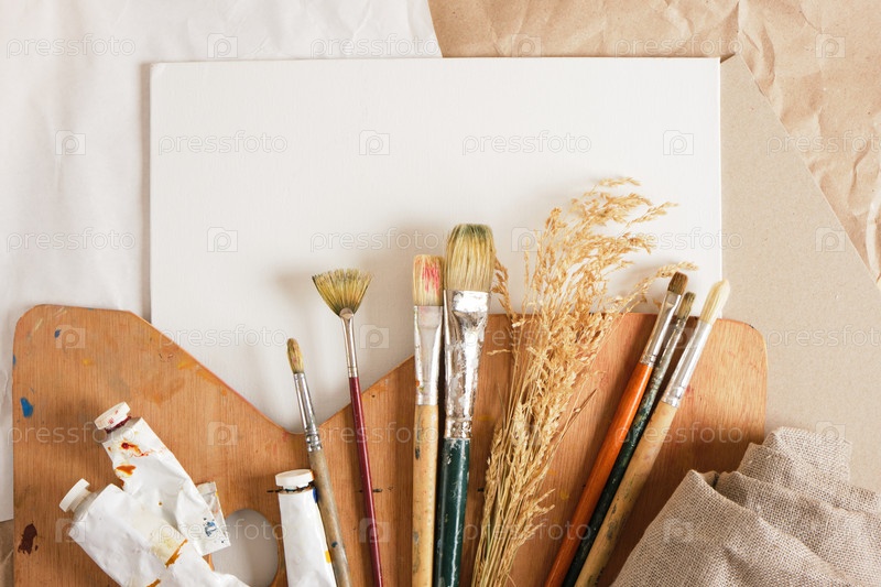 Набор кистей, краски в тюбиках, деревянная палитра, белый холст на картоне и бумага на льняном фоне, концепция мастерской художника