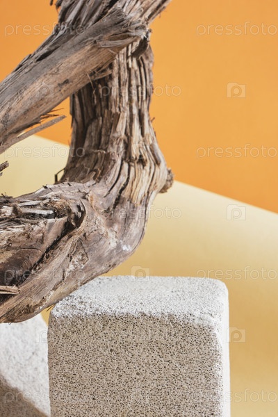 Пустой подиум для презентации продуктов. пустой бетонный подиум для продукта на деревянном фоне коряг, коричневый фон макет
