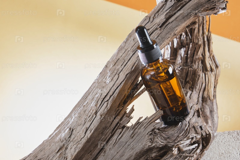 Коричневая стеклянная бутылка с пипеткой на деревянной коряге, коричневый фон, натуральная косметика для ухода за кожей тела