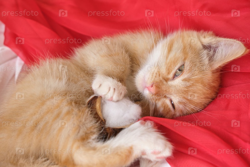 Милый рыжий котенок лежит на красной воздушной ткани, спящий котенок копирует пространство