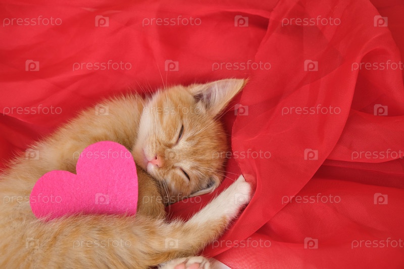 Розовое сердце из фетра и милый рыжий котенок лежит на красной воздушной ткани