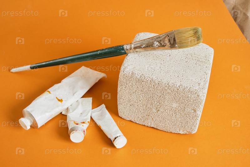 Тюбики с краской, кисть на бетонном подиуме, пространство для копирования концепции художественной мастерской