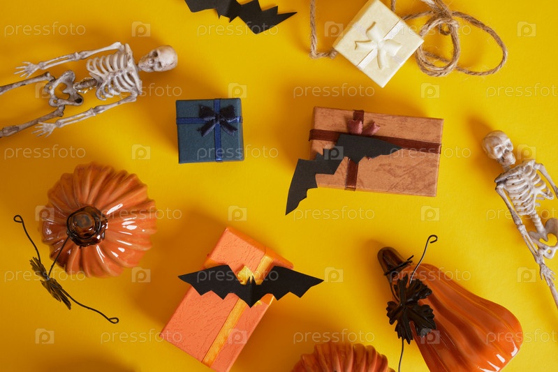 Хэллоуин декор и подарочные коробки на желтом фоне вид сверху, скелеты, тыквы и подарки