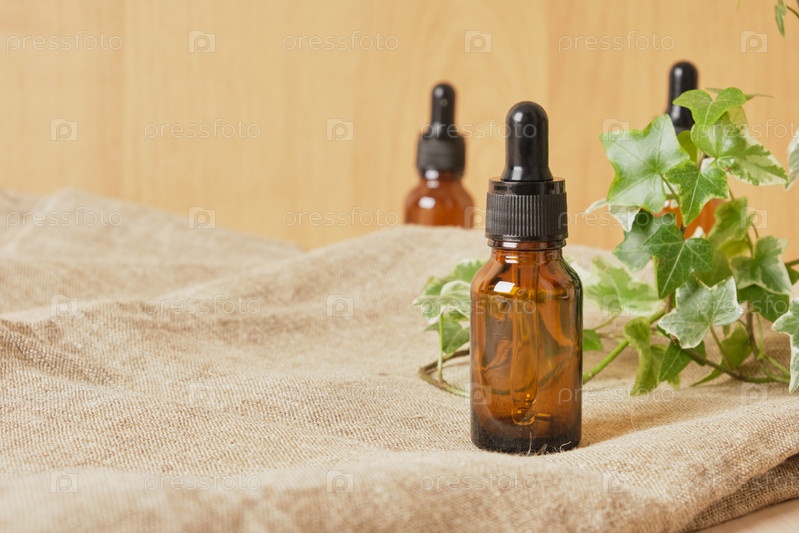 Пипетка из коричневого стекла с косметическим маслом и растением на льняной ткани, коричневый фон