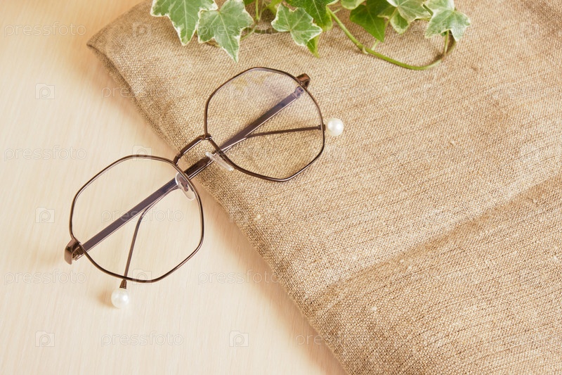 Стильные очки и листья растений на льняной ткани, коричневое пространство для копирования фона