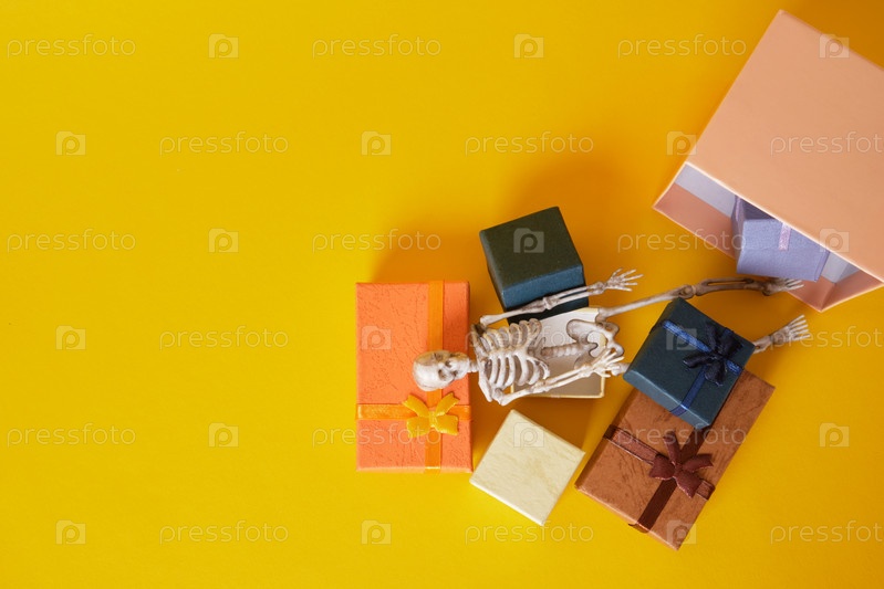 Пластиковый скелет и подарочные коробки на желтом фоне, концепция хэллоуина, скелет выпал из подарочной коробки, скелет ползает по подаркам