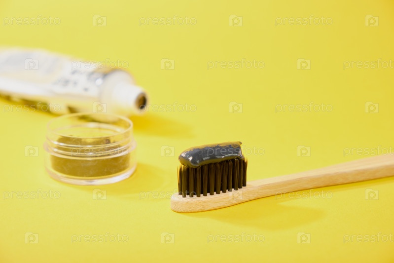 Бамбуковая зубная щетка с черной угольной зубной пастой на угольно-желтом фоне