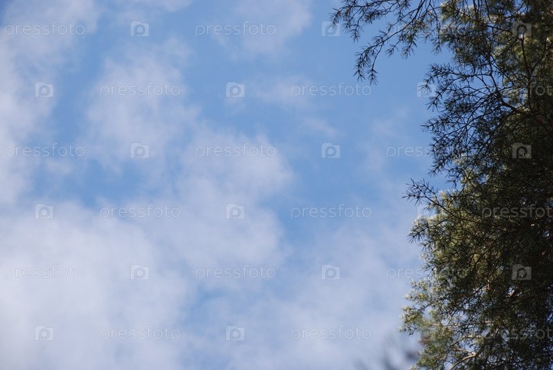 Светло-голубое небо с небольшими деревьями облаков. Весенний солнечный день небольшие облака разной формы на фоне голубого неба. По краям возвышаются верхушки различных деревьев