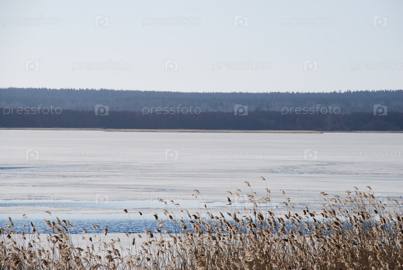 Тростник лед и вода на широкой реке. В солнечный весенний день изо льда у берега реки растут сухие высокие желтые камыши. В середине реки открытая вода и лед
