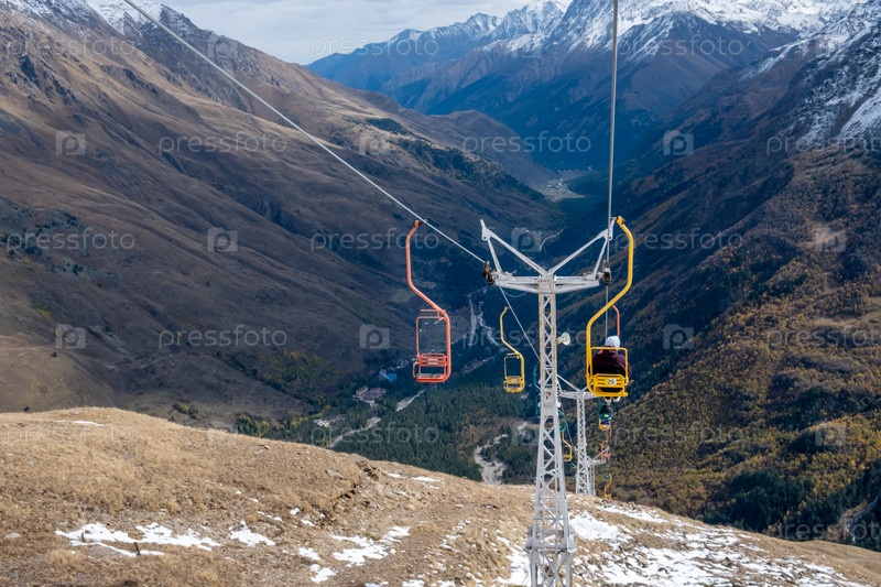 Горный пейзаж с креслами одноместной канатной дороги
