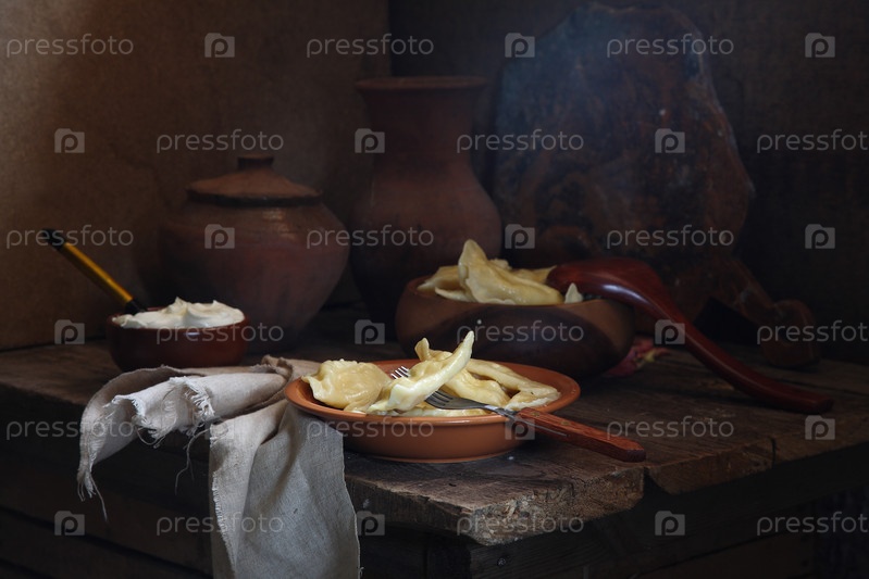 Натюрморт с варениками с творогом и сметаной на деревянном столе