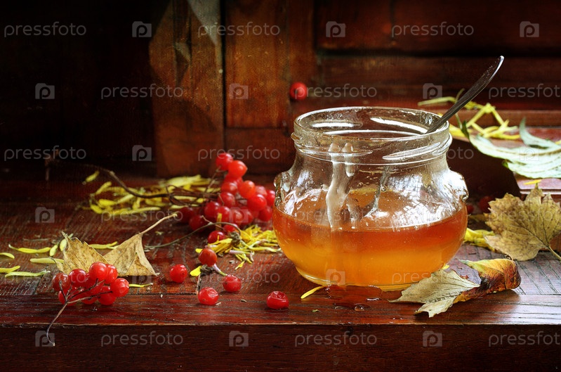 Мед с калиной на деревянном фоне