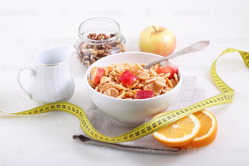 Мюсли с молоком и яблоком на белом фоне