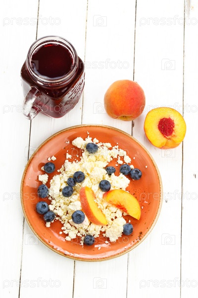 Натюрморт с творогом, голубикой и персиком на белом деревянном фоне