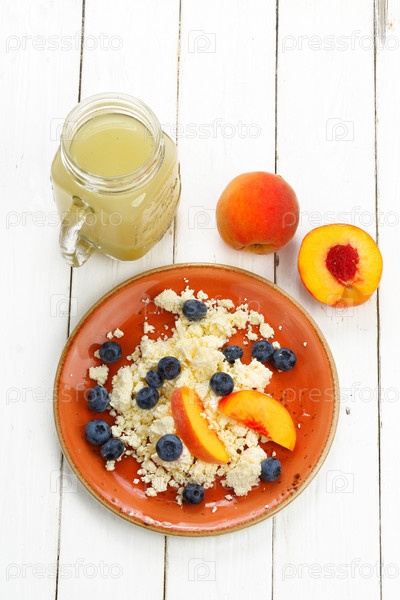 Натюрморт с творогом, голубикой и персиком на белом деревянном фоне
