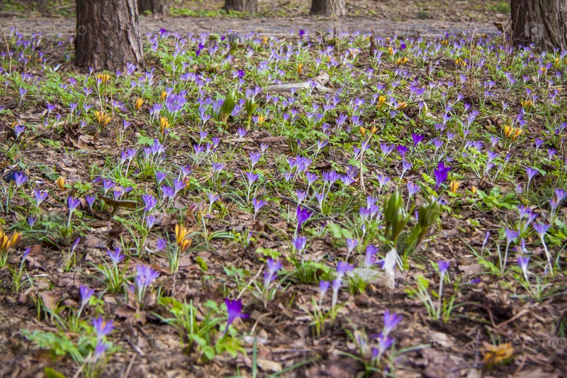 Примулы крокусы весной на поляне в лесу. Весна возрождается в лесу. Сухие листья сменяются первыми цветами,