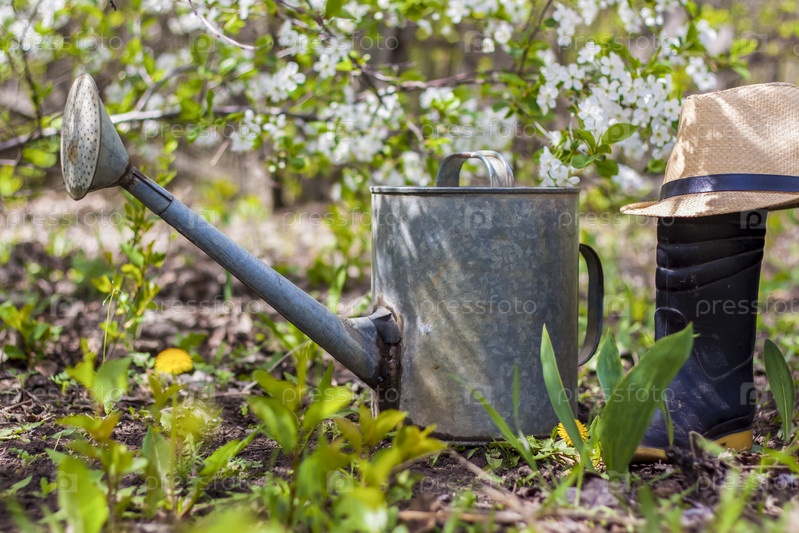 В саду стоят старая железная лейка, шапка и резиновые сапоги. Садоводство и садоводство,
