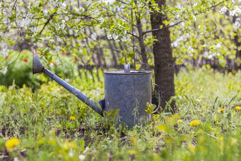 В саду стоит старая железная лейка. Садоводство и садоводство,