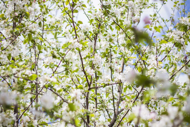 Белые цветы цветущей яблони весной на фоне голубого неба в солнечный день крупным планом на природе на открытом воздухе