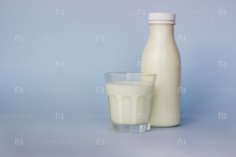 Стакан и бутылка белого молока, выделенные на синем фоне, крупным планом