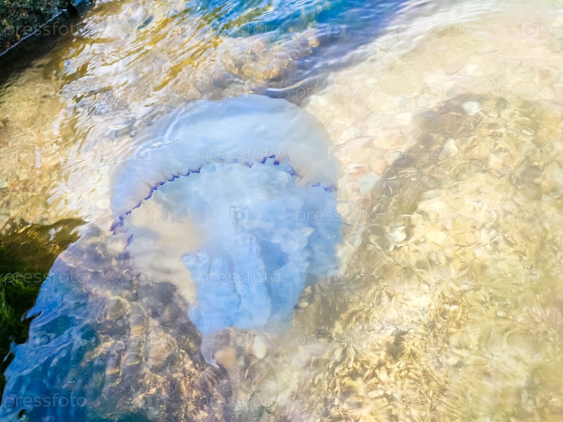 Белые медузы плавают у берега моря. Раковина побережья моря