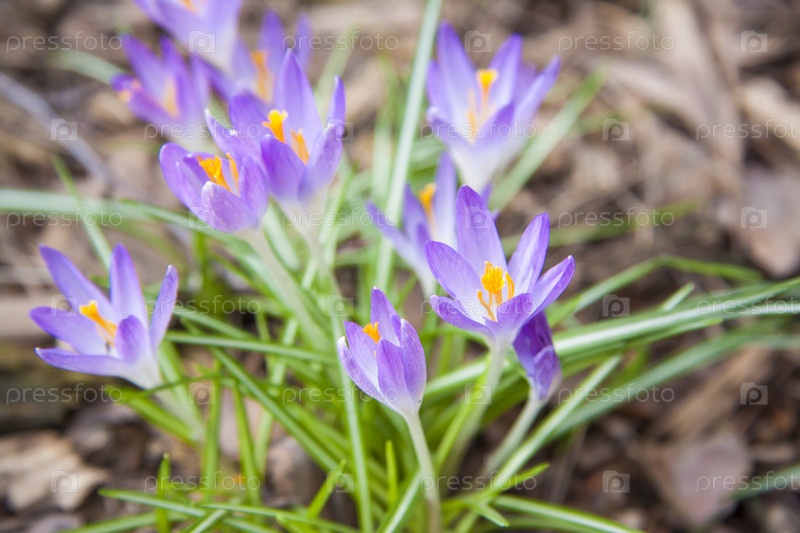 Примулы крокусы весной на поляне в лесу. Весна возрождается в лесу. Сухие листья сменяются первыми цветами,