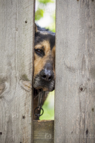 Красивая собака, домашняя собака, увидела, как он просунул голову в щель в садовой ограде. Морда собаки