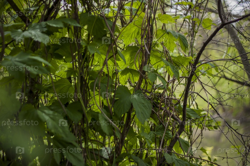 Растения красиво переплетаются с кустарниками у реки. Весна, солнце, сочная зелень