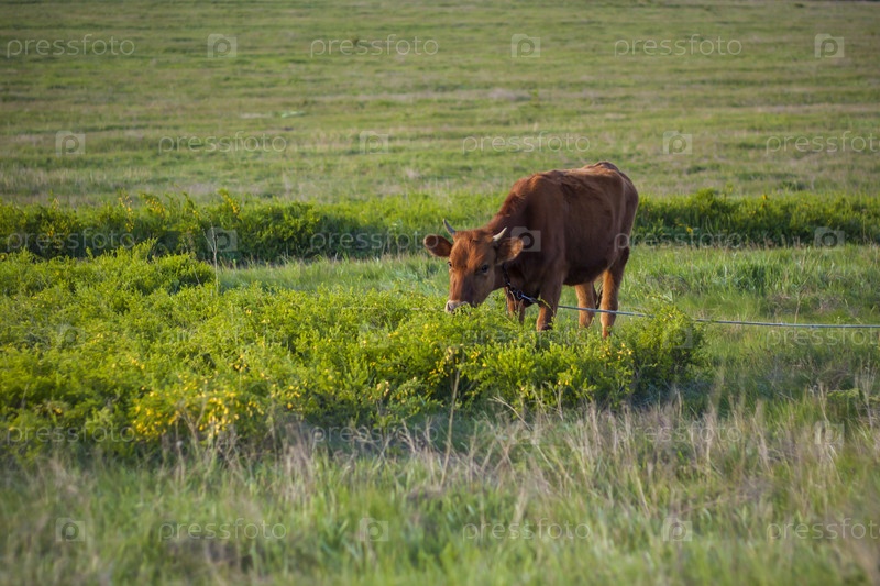Быки и коровы пасутся на сочном поле весной на закате. Сельская местность