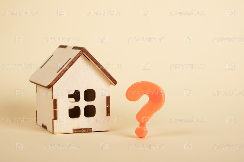 Модель маленького деревянного дома и вопросительный знак на бежевом фоне