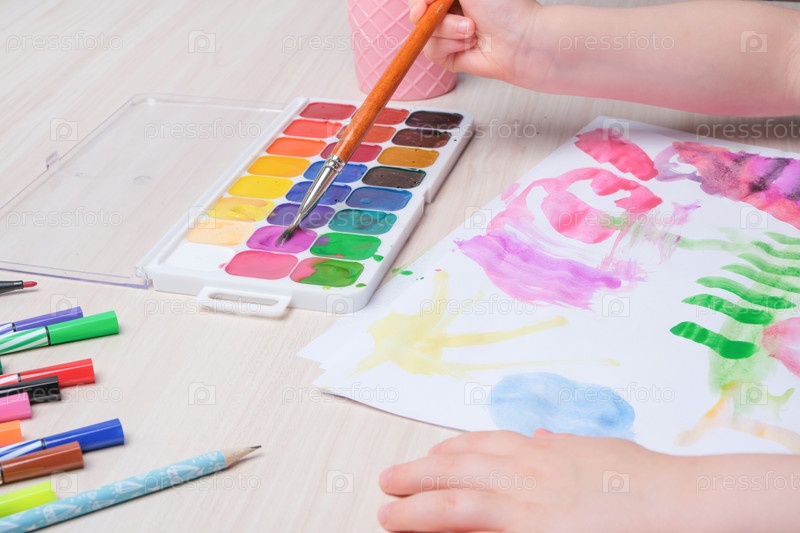 Маленький ребенок рисует акварелью на бумаге за столом