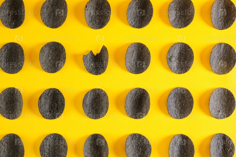 Узор из черных картофельных чипсов на желтом фоне, пространство для копирования, чипсы из натуральных ингредиентов, трендовые закуски