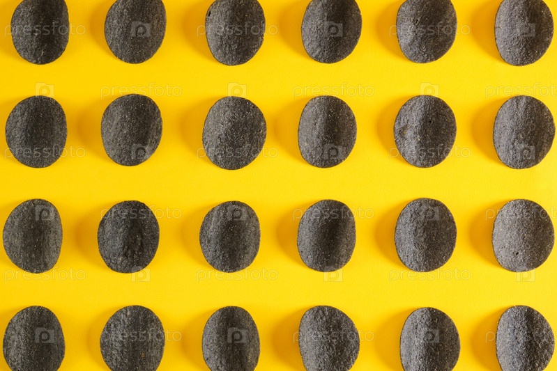 Узор из черных картофельных чипсов на желтом фоне, пространство для копирования, чипсы из натуральных ингредиентов, трендовые закуски