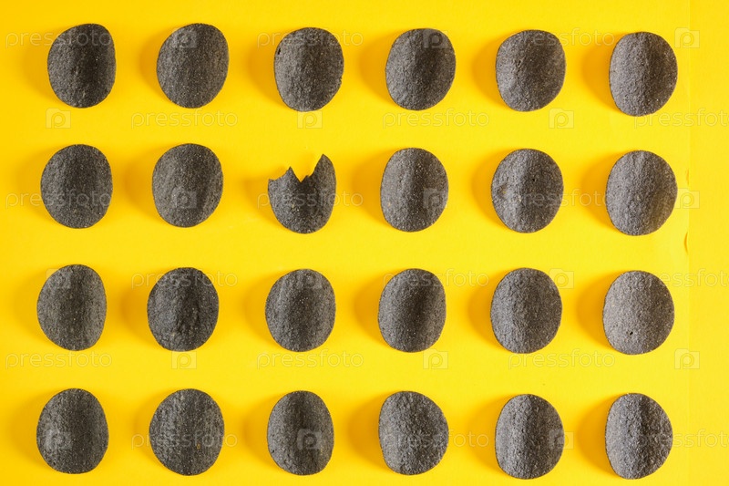 Узор из черных картофельных чипсов на желтом фоне, пространство для копирования, чипсы из натуральных ингредиентов, трендовые закуски
