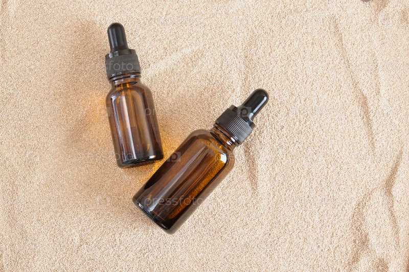 Коричневые стеклянные бутылки с дозатором для пипеток на фоне песка