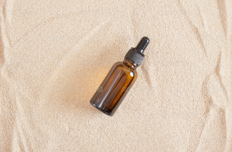 Коричневые стеклянные бутылки с дозатором для пипеток на фоне песка