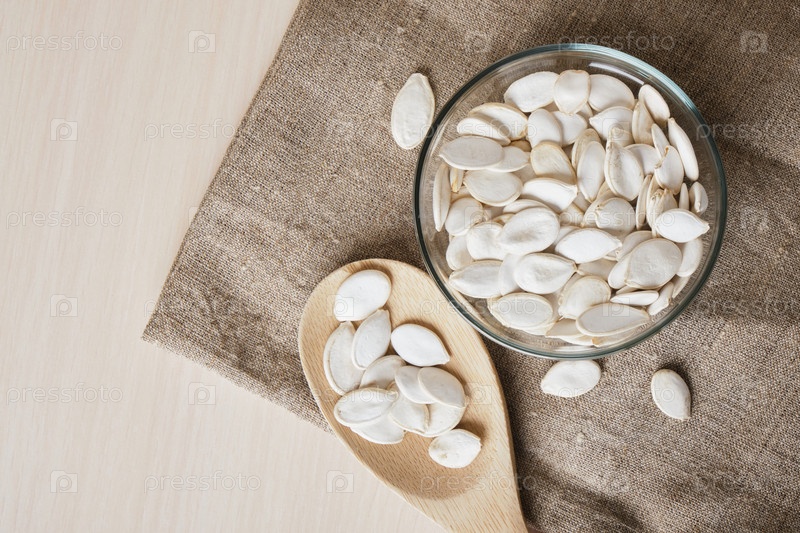 Семена тыквы в белой миске и ложка на льне на столе для копирования