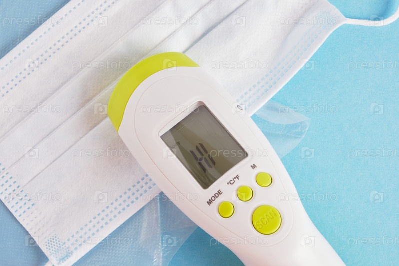 Лицевая маска и инфракрасный бесконтактный термометр с цифровым экраном, надпись высоко на экране