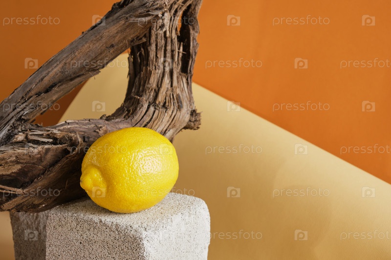 Духи с концепцией запаха лимона, лимон с брызгами духов на бетонном подиуме на фоне коряг