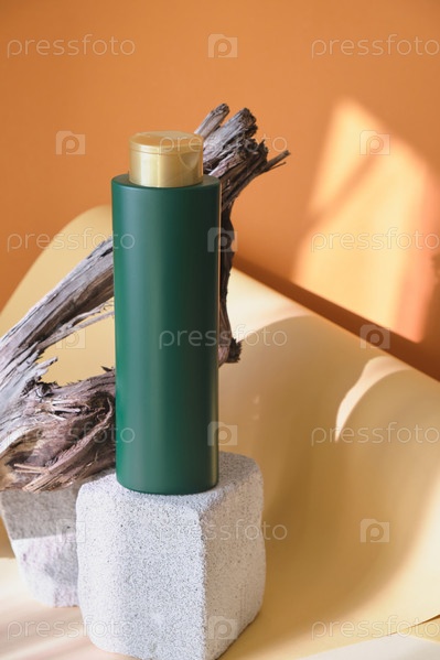 Зеленая бутылка для шампуня или бальзама для волос на бетонном подиуме на фоне деревянной коряги, коричневый фон, солнечный свет из окна, красивые тени