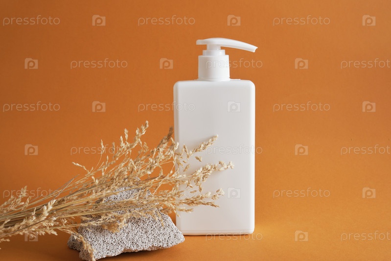 Белая бутылка без логотипа на коричневом фоне, осколок камня и цветка, концепция натуральной косметики