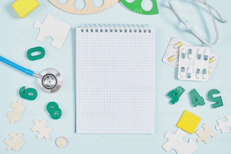 Блокнот, стетоскоп и развивающие игрушки на синем фоне, концепция диагностики детских заболеваний