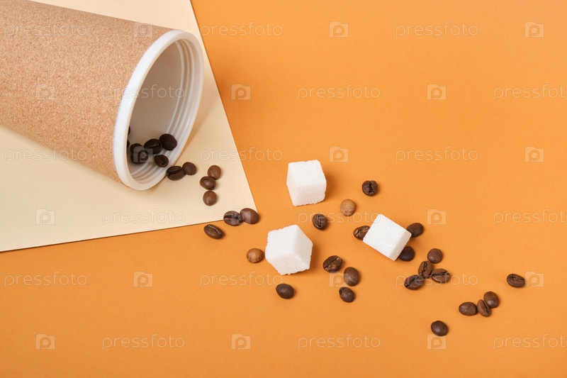Термокружка, разбросанные зерна кофе и кубики белого сахара на коричневом и бежевом геометрическом фоне