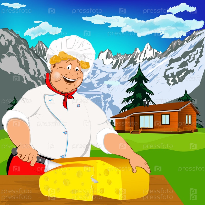 Сыродел и аппетитный молочный швейцарский сыр с высокогорных альпийских лугов
