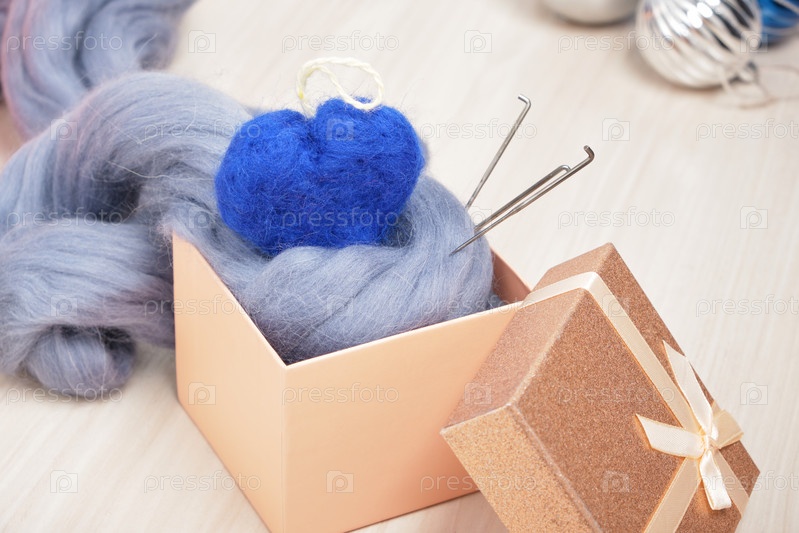 Валяние шерстяного сердечка из иголки и моток шерсти в подарочной коробке на столе, валяние елочных игрушек