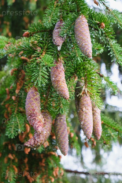 Шишки деревьев со смолой, натыкающейся между сосновыми иголками