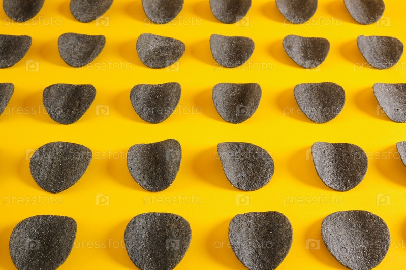 Узор из черных картофельных чипсов на желтом фоне, пространство для копирования, чипсы из натуральных ингредиентов, трендовые закуски
